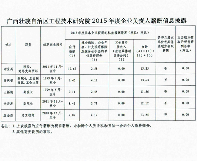 廣西壯族自治區(qū)工程技術(shù)研究院2015年度企業(yè)負(fù)責(zé)人薪酬信息披露